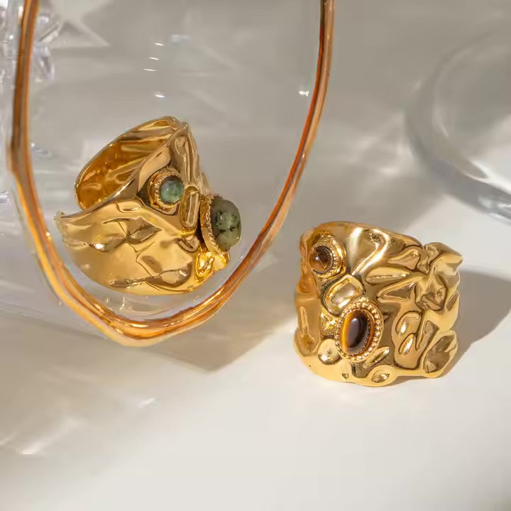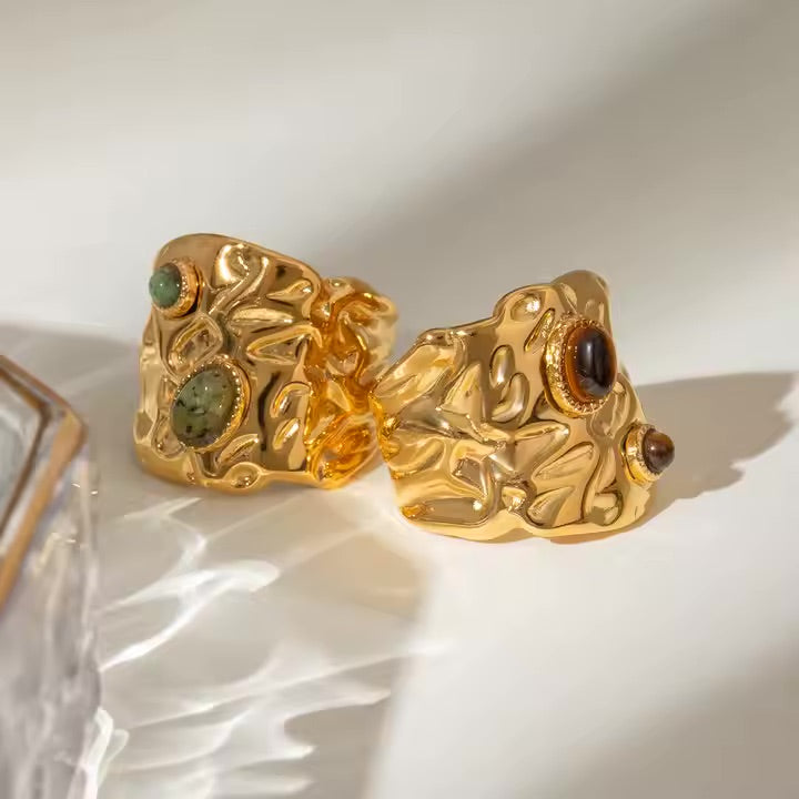Add some playful luxury to your jewelry collection with our Hammered Horizon Ring. Made from stainless steel and coated in 18K gold, this unique ring features a round oval tiger eye and a hammered design for added flair. Perfect for any occasion, this ring is sure to make a statement!